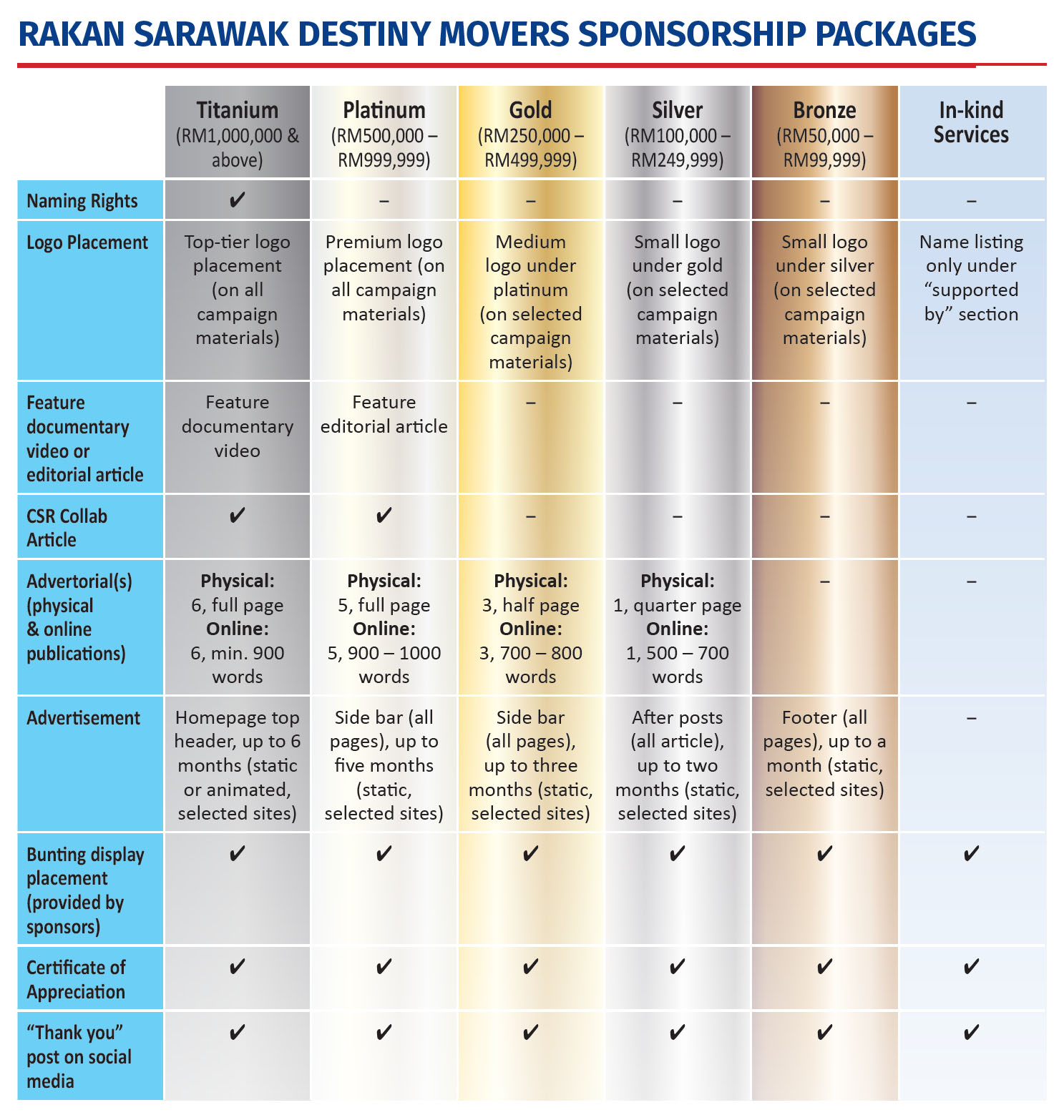 - Up to 1 month of footer (all pages) (static) on relevant online publications (Rakan Sarawak, Rakan Sarawak Community, Sarawak Impact, SMART Sarawak, SarawakYes!)